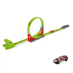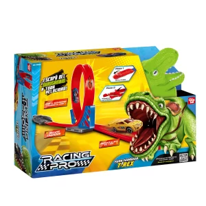 La pista Fuga Jurásica de Racing Pro pone a prueba tu velocidad mientras escapás de las garras del dinosaurio más temible. Con lanzador de vehículos y un recorrido lleno de acción, cada carrera es un desafío contra el tiempo.