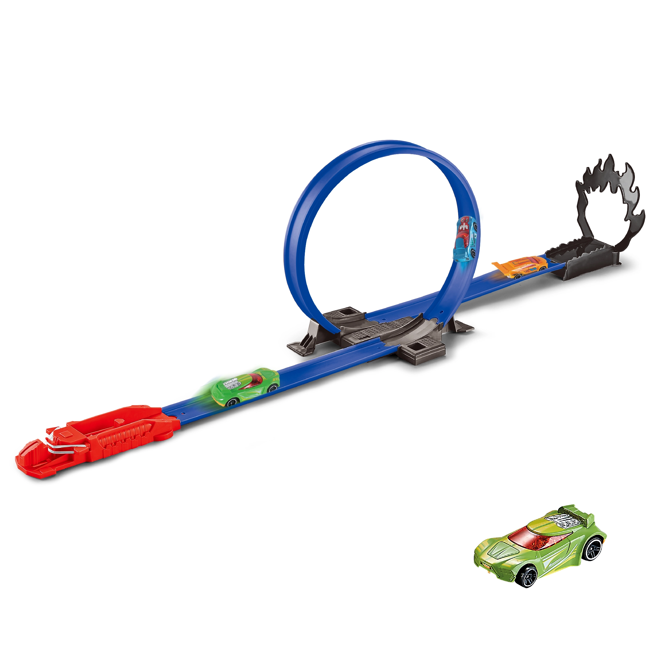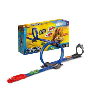 Con la pista Salto Infernal de Racing Pro, tu auto debe tomar velocidad, enfrentar el looping y atravesar el fuego en un salto espectacular. Incluye lanzador de potencia y obstáculos que hacen que cada carrera sea única.